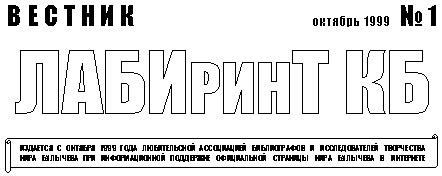 Вы только что прочитали первый номер Вестника Любительской ассоциации библиографов и исследователей творчества Кира Булычева (ЛАБИринТ КБ). Ассоциация ЛАБИринТ КБ была создана на базе Официальной страницы Кира Булычева в Интернете не случайно — это попытка реанимировать существовавший в начале 90-х годов заочный клуб по переписке «Алиса Селезнева» (Клуб «АС»), «умерший» в 1994 году вместе с одним из его основателей, президентом Клуба «АС» С. Н. Елисеевым из подмосковного Жуковского. С кончиной Сергея Николаевича завершилась и короткая трехгодичная жизнь нашего клуба: всю переписку Сергей Николаевич нес на своих плечах; именно он, живя практически в столице нашей страны, трижды собирал коллег на «Булычевские чтения». После него оказалось некому оперативно подхватить бразды правления клубом. Постепенно о клубе не стало слышно… В начале 1999 года на литературном сервере «Русская фантастика» открылась Официальная страница Кира Булычева в Интернете. Я, как редактор этой страницы, начал получать письма от читателей, которым небезынтересно творчество писателя. Среди прочих оказалось и несколько писем от активных в прошлом членов Клуба «АС». Вновь стал собираться и расширился дружный коллектив людей, объединенных одним увлечением — Кир Булычев. Кто-то из них составляет списки публикаций фантаста, кто-то — перечень фильмов, кто-то — энциклопедию выдуманных Булычевым животных и миров; кто-то пишет исследовательские статьи, кто-то — рецензии; кто-то берет интервью, кто-то рисует иллюстрации, но все они занимаются общим делом — популяризацией творческой и научной деятельности любимого писателя: всем тем, благодаря чему каждый новичок среди любителей фантастики может обнаружить для себя что-то интересное, что, хотелось бы верить, поможет ему найти себя в жизни. Все это заставило меня вернуться к идее создания клуба любителей творчества Кира Булычева, но уже на другом витке истории — в век компьютерных информационных технологий. Эту идею горячо поддержали мои единомышленники, давнишние любители (в действительности — профессионалы) творчества Кира Булычева: Алексей Ляхов (г. Киев), Андрей Попов (г. Краснодар), Вячеслав Яшин (г. Москва) и другие. Результат перед вами… Я надеюсь, что этот первый (праздничный) номер, приуроченный к юбилею Кира Булычева, не станет последним, а будет продолжать свою жизнь еще долгие годы. И, пользуясь случаем, обращаюсь ко всем читателям с просьбой: поддержите ассоциацию морально, помогите советом, окажите информационную поддержку. Пишите, звоните, заходите в гости.