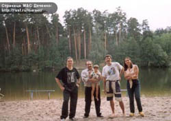 Лесное озеро.Боря Сидюк, Сергей Дяченко с дочерью, Дима Байкалов и Марина Дяченко