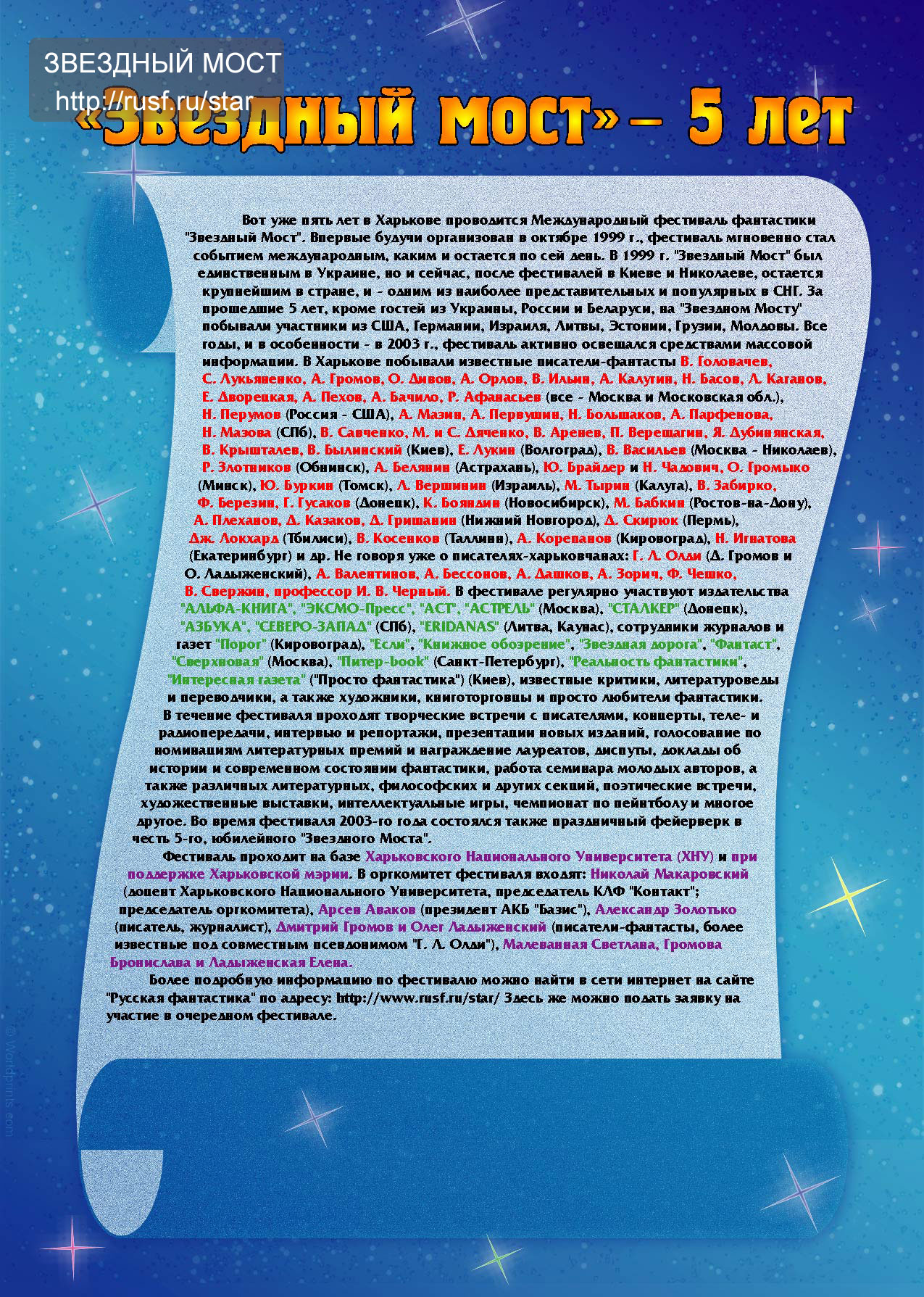 РУССКАЯ ФАНТАСТИКА | ЗВЕЗДНЫЙ МОСТ [ Оргкомитет ] [ Списки ] [ Фотоархив ] [ Статьи ] [ Премии ] [ Доклады ] [ Музыка ] [ Заявка ] [ Форум ]