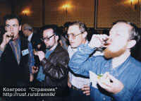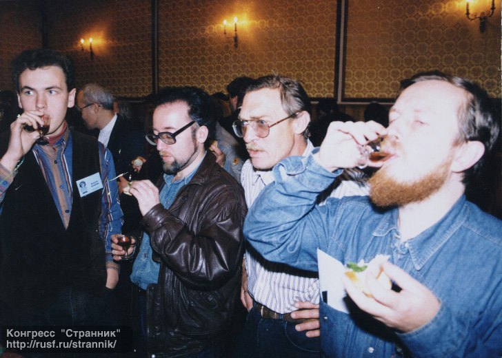 "За лауреатов!" Писатели Мария Семенова, Эдуард Геворкян, Владимир Баканов и поддерживающий их инициативу Александр Сидорович. |