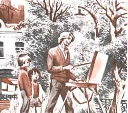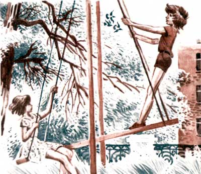 А сейчас Игорь писал в своей комнате — в те дневные часы, когда сентябрьское солнце врывалось в распахнутое окно. В комнате соорудили перекладину, подвесили самодельные качели — доску на толстых веревках. Иринка садилась на нее, Журка вскакивал, Игорь торопливо брался за кисть. И было хорошо — никаких зрителей, кроме Веры Вячеславовны. Но Вера Вячеславовна видела, что ее не стесняются нисколечко...