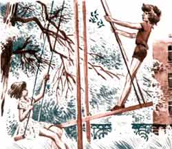 Холст был высотой больше метра, шириной сантиметров семьдесят. На нем среди солнечной зелени, за которой виднелись крыши и антенны, спокойно висели качели. Иринка в белом платьице с синими горошинами сидела, свесив с доски ноги, улыбалась и смотрела вверх — на Журку. Журка стоял, ухватившись за веревку, тянулся вверх и показывал куда-то в небо: то ли на веселых птиц, то ли на самолет. Но смотрел не в высоту, а на Иринку, словно спрашивал: "Видишь? Здорово, да?" В золотистом свете, тоненький, легкий, на прямых напружиненных ногах, он сам был как лучик, отраженный осколком зеркала с земли в небо.