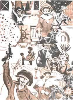 Карнавал получился замечательный. Иринка и Журка пришли одетые юнгами и лихо сигналили флажками новогодние поздравления. Горька читал стихи про бой с королевскими гвардейцами и палил из пистолета. Палил, пожалуй, лучше, чем читал, но ему хлопали и за то, и за другое. Сашка и Вовка Лавенковы изображали Карлсона и Малыша. Сашка для этого затолкал под широкий клетчатый пиджак две подушки и приладил к спине вентилятор с батарейкой, а Вовке ничего особенного и не понадобилось: джинсы, пестрая рубашка — вот он и Малыш. Были еще космонавты, Буратино, Чиполлино, страшный гоголевский Вий, одноногий Сильвер из "Острова сокровищ". Митька Бурин явился в богатырских доспехах, заявил, что он Илья Муромец, и устроил бой с шестиклассником Вовкой Графовым — тот махал крыльями из лохмотьев, пускал изо рта дым и свистел, как настоящий Соловей-разбойник. Битва получилась нешуточная, даже запахло скандалом: из-за дыма, которого набралось больше, чем хотелось бы...