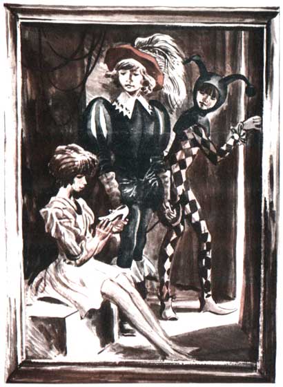На картине были Золушка, принц и шут перед началом спектакля. Они за кулисами ожидали своего выхода. Иринка в платье из мешковины сидела на фанерном ящике и, как ручного голубя, держала у груди сверкающую туфельку. На Иринкином лице дрожали цветные отсветы. Журка, одетый принцем, стоял сбоку и что-то говорил ей (может быть, просил не волноваться, хотя сам заметно нервничал). Но Иринка его, видимо, не слышала: чуть улыбаясь, она совсем ушла в свою сказку...