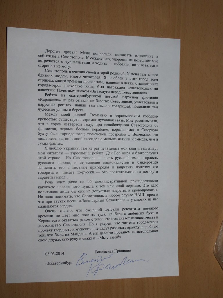 Очень жалею, что оживший детский ревматизм военного времени не дает мне поехать туда, на берега любимых бухт и Херсонеса и оказаться рядом с теми, кто отстаивает независимость и достоинство Севастополя. Но я уверен, что жители города-героя проявят твердость и мужество, не дадут развязать вражду, подобную той, что была на Майдане. А мы давайте протянем севастопольцам свою дружескую руку и скажем: «Мы с вами!»